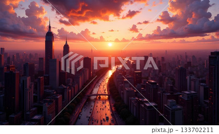 ゲーム背景 高層ビルから見える現代都会都市の夜景