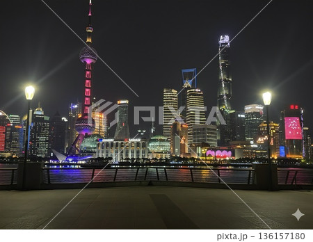 香港をイメージした摩天楼の夜景に打ち上げ花火が上がり水面に反射する風景