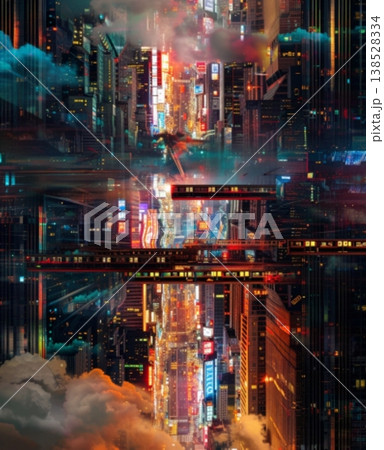 ビル群の間を結ぶ夜行列車と近未来の都市夜景