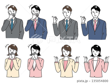 ビジネス人物の成果・評価シーン線画4種セット(ガッツポーズ・喜ぶ・困っている・謝る