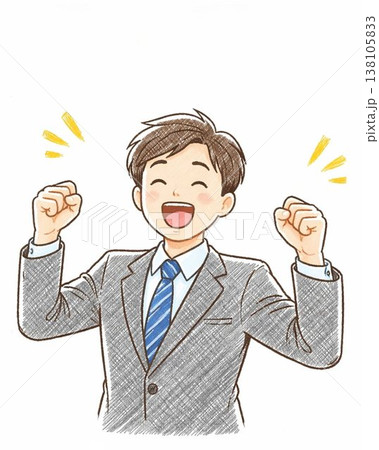 ガッツポーズをするスーツ姿の若い男性の手描きイラスト
