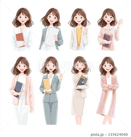 春 新生活 日本人女性 イラストセット 卒業 入学 桜 白背景