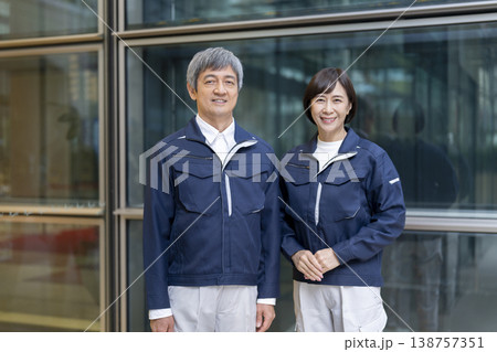 カメラ目線で微笑む作業服を着た60代の男女 マンション管理人・施設スタッフ イメージ