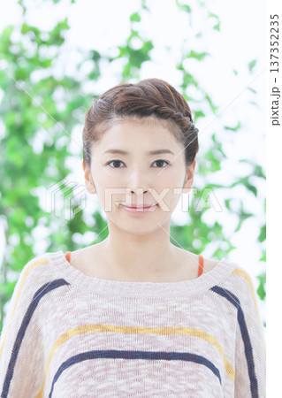 ピンク背景で微笑む美しい日本人女性のポートレート ビューティー・スキンケア素材