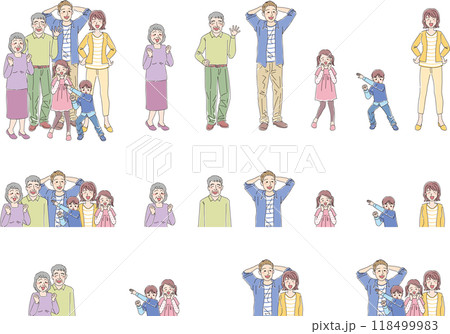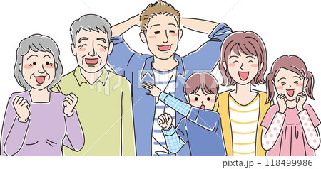 3世代6人家族_楽しそうな家族_全身_セット_背景色あり