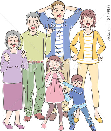 人物イラスト_笑顔の人々_色々な年代の人たち_6人家族_幼児両親祖父母