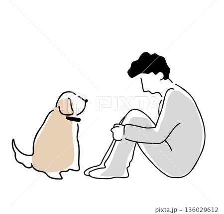 膝を抱える男性と犬の線画イラスト 色付き