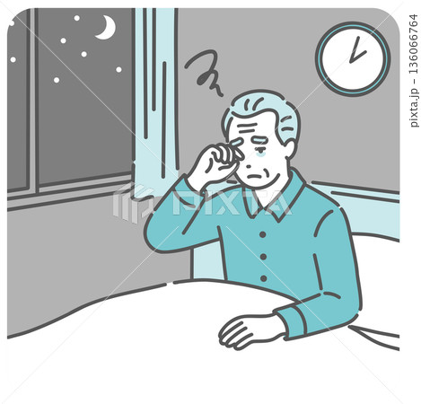 夜中に目が覚めて眠れない高齢男性のイラスト(不眠・中途覚醒・認知症)