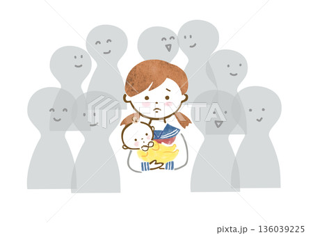赤ちゃんを抱っこした、孤独を感じているセーラー服姿の女の子のイラスト