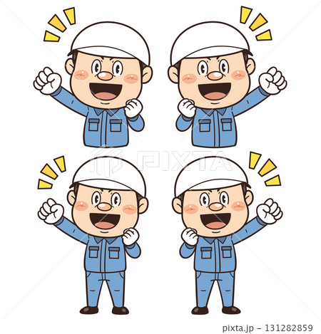 工場や現場で働く男性作業員が拳を握ってやる気を出しているイラスト