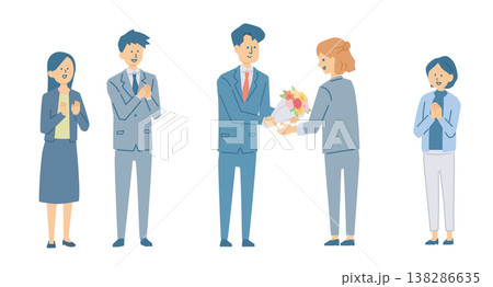 退職祝いで花束を受け取る男性と拍手する同僚たちのイラスト
