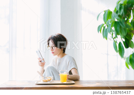 スマホを見ながら朝食を食べる女性