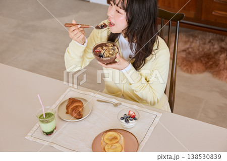 アサイーボウルを食べる若い女性の健康的な朝食シーン
