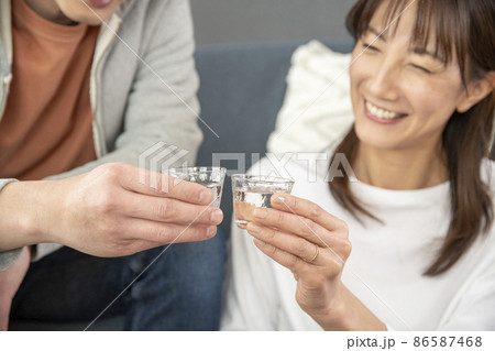 リビングでビールを飲む日本人の女性