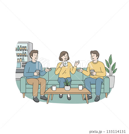 リビングのソファーでくつろぐ若い夫婦のシンプルイメージイラスト