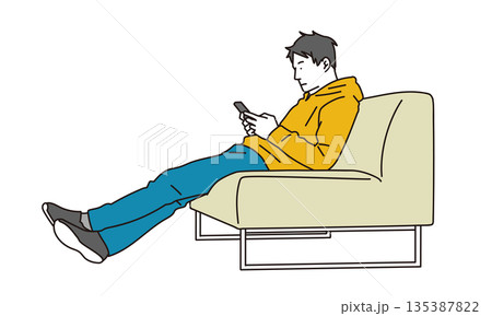 ソファでくつろぎながら携帯を操作する若い男性のイラスト素材