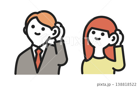 耳に手をあてて話を聞くビジネスマンとビジネスウーマンのイラスト