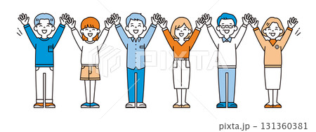 笑顔でバンザイする、様々な年齢の男性と女性の上半身ベクターイラスト素材セット_カラー