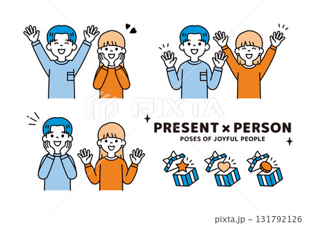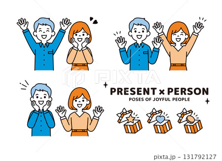 プレゼントと、笑顔で大喜びする若い男性と女性の上半身ベクターイラスト素材セット_カラー