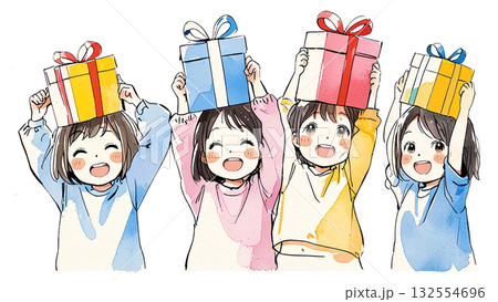 万歳!プレゼントに歓喜する、ポップで可愛い子どもたちのラインアート