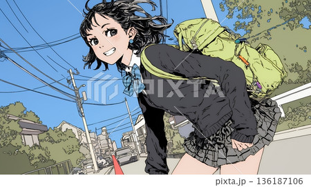 制服を着て走る学生 男女 制服 横顔 学校 全身