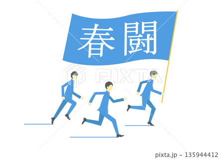 春闘の文字が書かれた旗を持って走るビジネスチーム