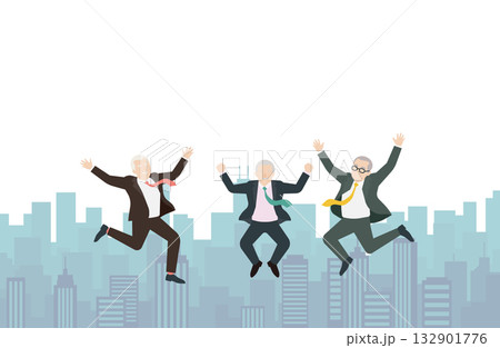 大都会を背景に喜びのジャンプをするおじさん達