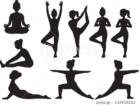 あぐらをかいてヨガをする女性。座禅、ヨガのポーズ, ストレッチ、ジム、瞑想、運動。イラスト