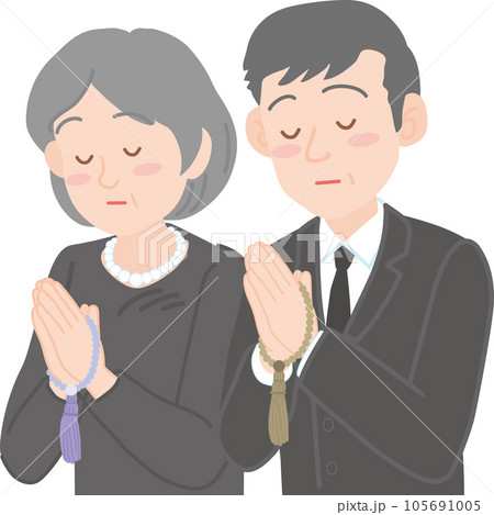 葬儀関係のイラスト_数珠を持って目を瞑り手を合わせる高齢男女._奥女性_手前男性