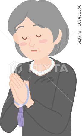 葬儀関係のイラスト_数珠を持って目を瞑り手を合わせる高齢女性