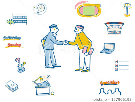 色違いの作業服を着た男性2人が握手する上半身イラスト