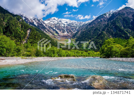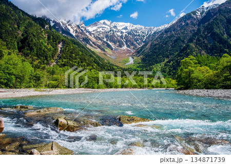 上高地の絶景『美しい梓川の流れと穂高連峰 新緑シーズン』