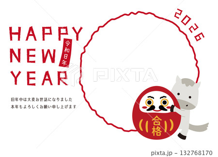 2026年 丸1つのフォトフレーム年賀状 白背景 合格達磨と白馬