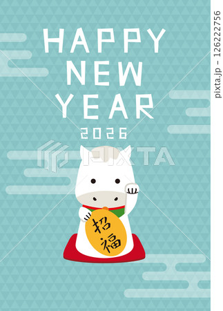 年賀状2026招き馬 招福 雲 水色背景 縦 白馬