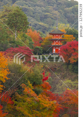 紅葉に包まれた秋の清水寺の三重塔 リフレクション