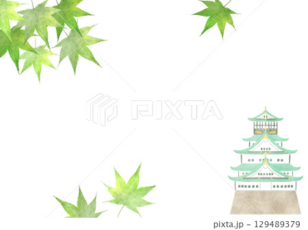 水彩で描いた紅葉に包まれる大阪城のイラスト