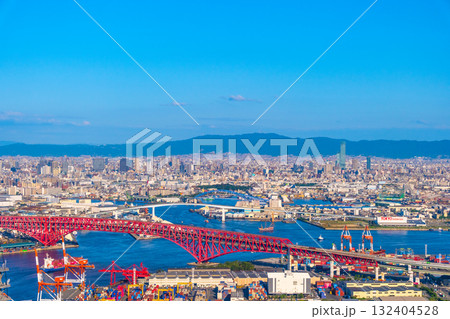 大阪府大阪市 夕日に照らされる大阪湾とさきしまコスモタワー周辺の街並み