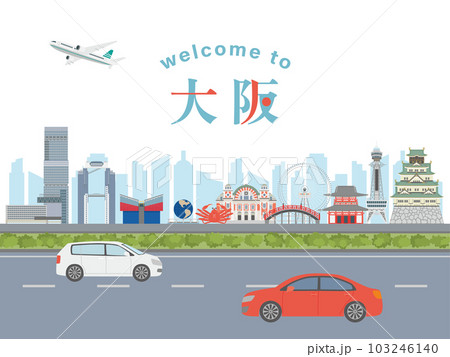 秋の大阪の観光地の街並みのシンプル線画セット(New)