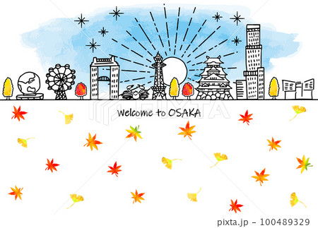 手書きの大阪の秋の観光地の街並みスカイラインと紅葉