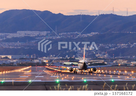 大阪国際空港(伊丹空港)の滑走路への航空機着陸 夕景