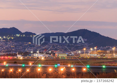 大阪国際空港(伊丹空港)の滑走路からの航空機離陸 夕景