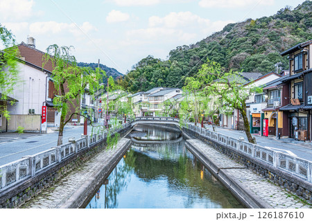 早朝の城崎温泉の町並み 風情ある枝垂れ柳