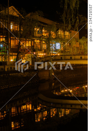 夜の城崎温泉 柳並木と水鏡(兵庫県豊岡市)