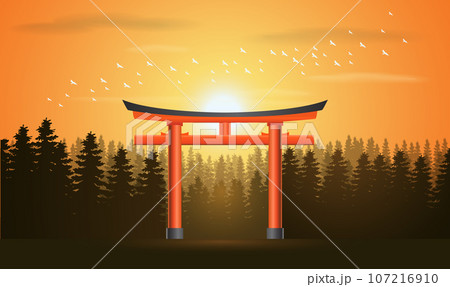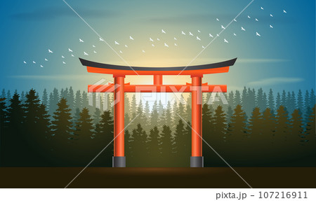 Torii gates, beautiful scene with Sunset in japan, vector illustration