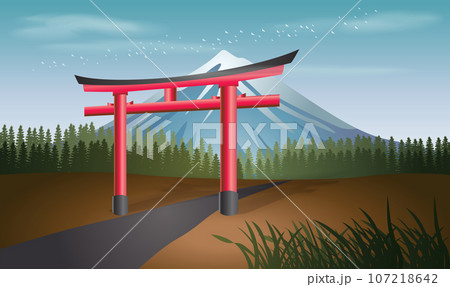 Torii gates, beautiful Sunset scene with mountain in japan, vector illustration