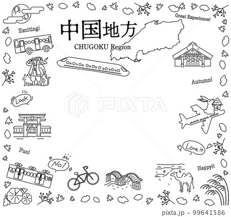 日本の中国地方の秋の名物観光のアイコンのセット(線画白黒)