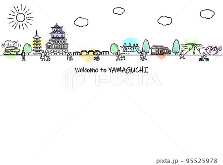 夏の山口県の観光地の街並みと太陽のシンプル線画セット