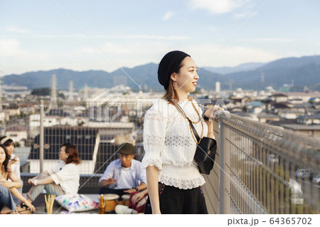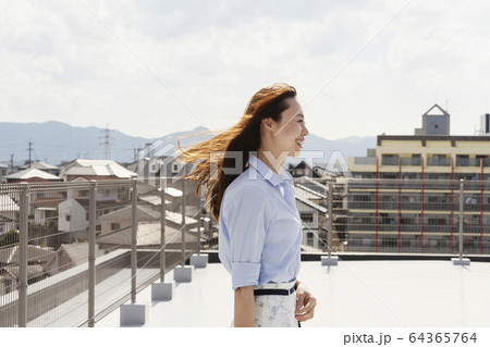 High angle view of Japanese woman standing on a rooftop in an urban setting.