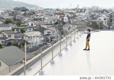 High angle view of Japanese man standing on a rooftop in an urban setting.