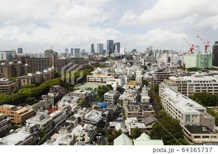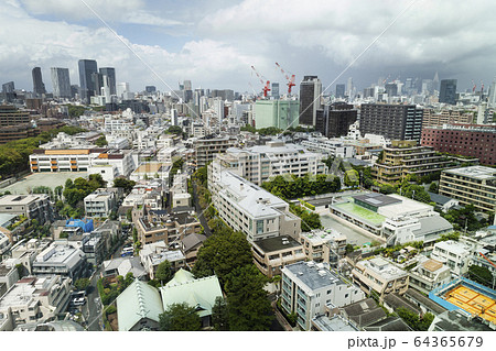 High angle view of group of young Japanese men and women standing on a rooftop in an urban setting.